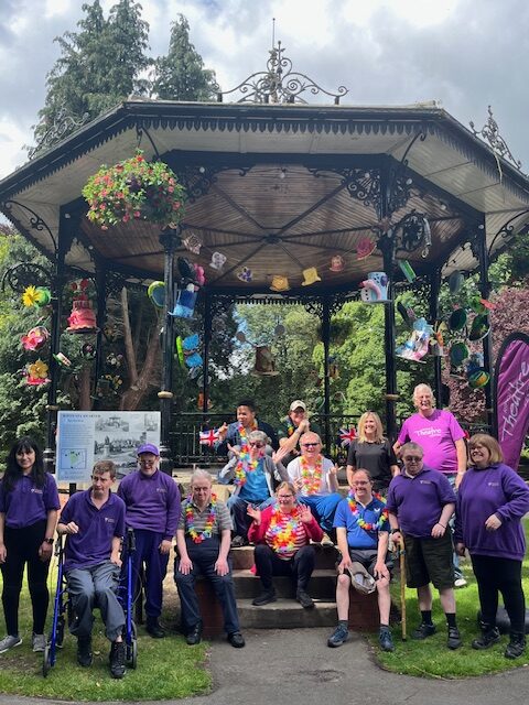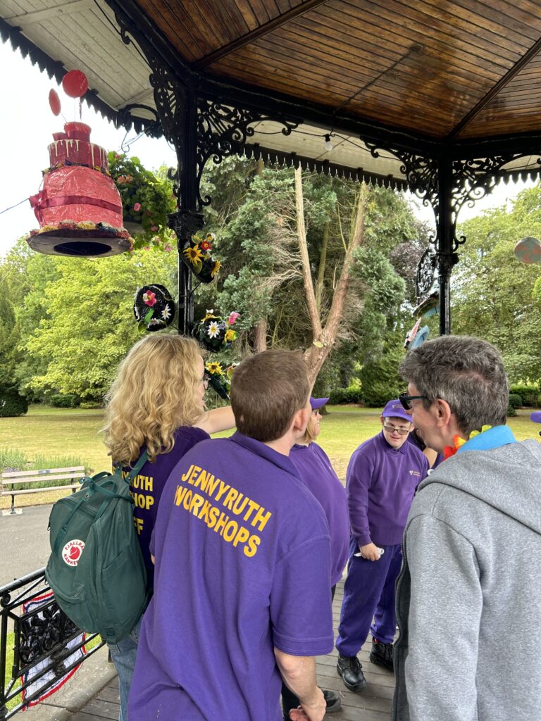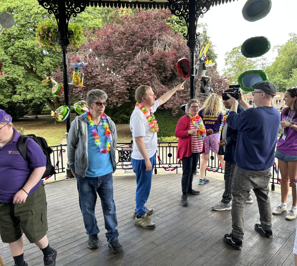 Groups of artists from Jennyruth Workshops and Ripon Walled Garden met up with artist Sharon Hockin to celebrate the completion of the Hats project. RTF volunteer, Mike Spurgeon (pictured here with Sharon and the makers) had forged ingenious brackets to display the work in keeping with the bandstand’s Victorian style.